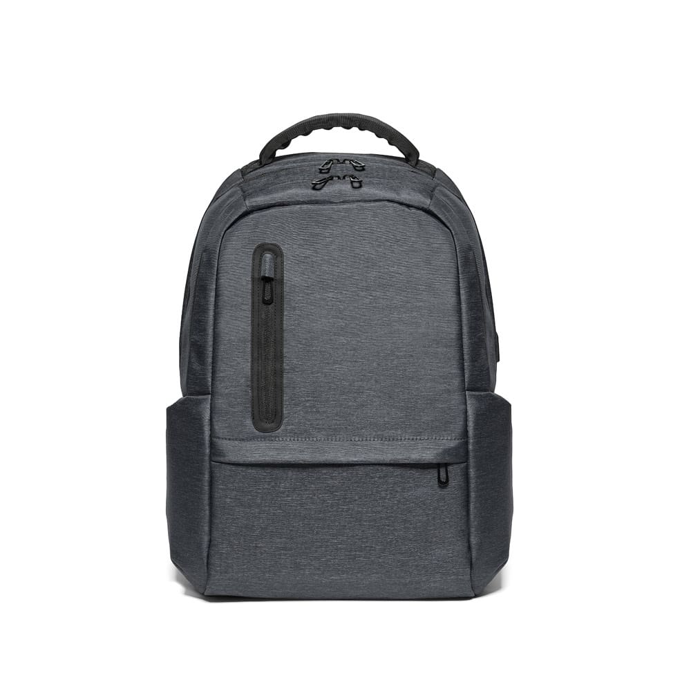 Waterproof 2Tone Nylon laptop backpack with 2 compartments. Lined rear compartment with interior zipped pocket and padded partition for laptop up to 17”. Lined front compartment with several interior pockets. The backpack has 2 front pockets and 2 side pockets. USB port and USB/micro USB cable to connect to mobile devices. Padded straps and back with padded support system for the back. Accessories not included. Capacity up to 26 L. 310 x 470 x 200 mm