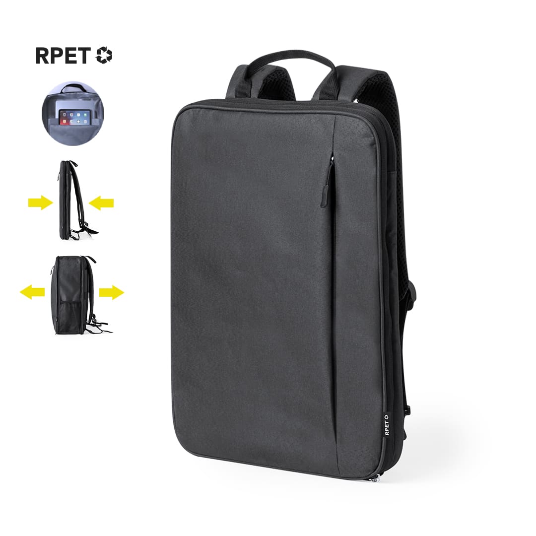 Extendable backpack made of resistant 600D RPET. Equipped with double pull zip closure, with the option to expand the capacity. Inside, it has padded compartments designed for tablets up to 10 inches laptops up to 15 inches. The shoulder straps are padded, adjustable and removable, and can be stored in the back pocket. The backpack includes a strap for luggage fitting and a top handle for easy carrying. RPET badge on label. Presented in an individual Recycled bag.