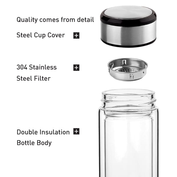 DOUBLE WALL GLASS INSULATION BOTTLE Designed for Steel Cup Cover, 304 Stainless Steel Filter, Double insulation bottle body.