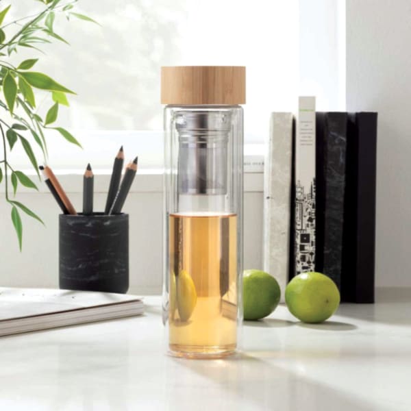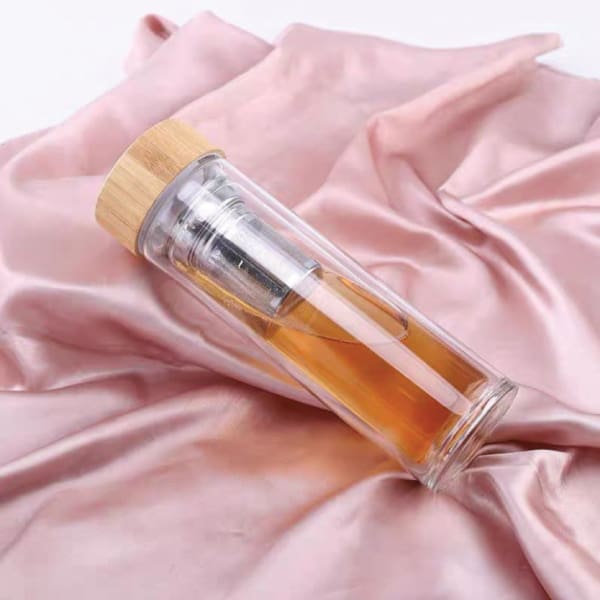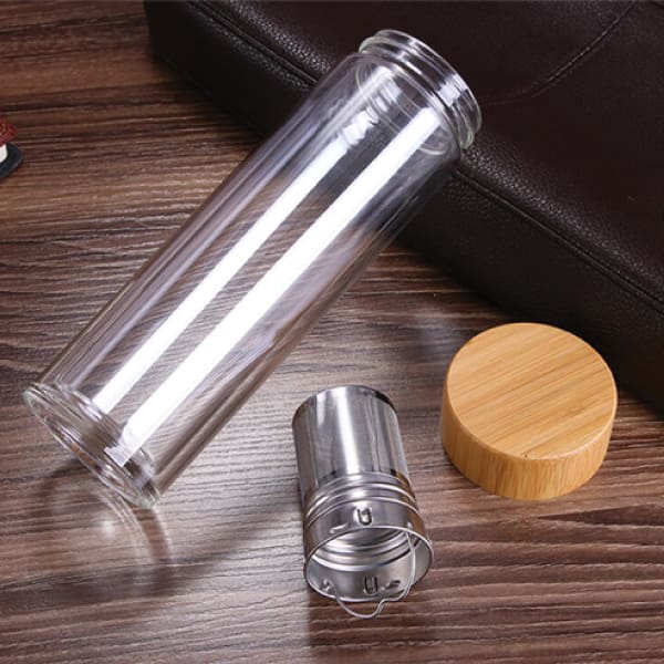 DOUBLE WALL GLASS INSULATION BOTTLE Designed for Wooden Cap, 304 Stainless Steel Filter, Double insulation bottle body. Material: Glass. Stainless Steel, Wood