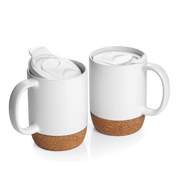 CERAMIC MUG WITH CORK BOTTOM The mug comes with a push-on, splash and dust proof lid, you can enjoy your drink through the sliding cover at the top