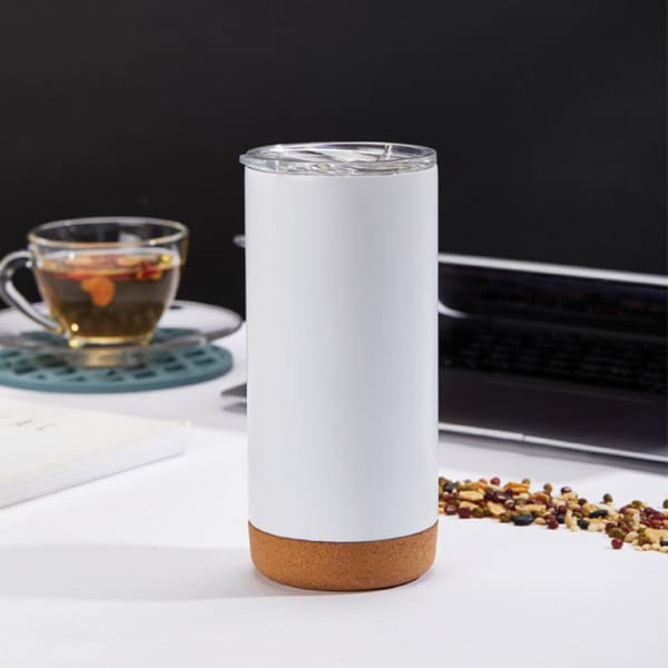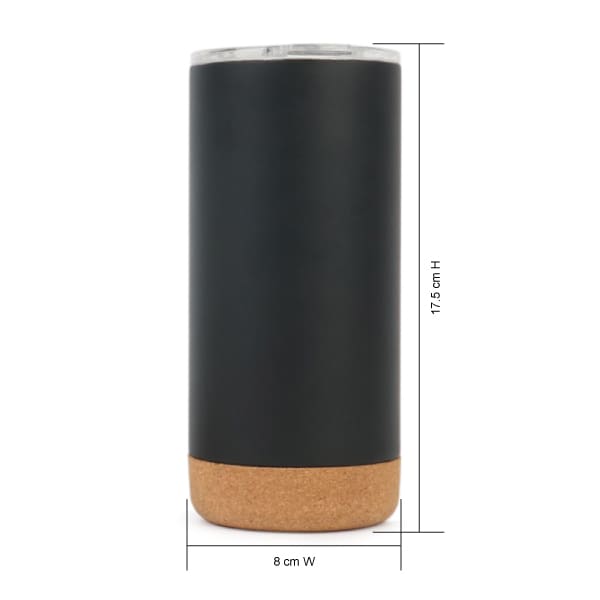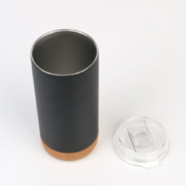 STAINLESS STEEL MUG WITH CORK BOTTOM A mug featuring a beautifully-accented cork wood bottom. Features: Double wall, vacuum insulated 18/8 stainless steel tumbler with powder coated finish