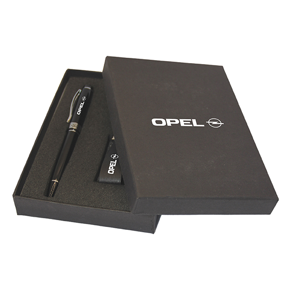 PROMOTIONAL GIFT SETS AMP-040 : Metal Ball Pen Twist AKE-05: Metal Keychains with Leather Strap Packing Top Small Gift Box Size: 17×14.5×2.6 cm