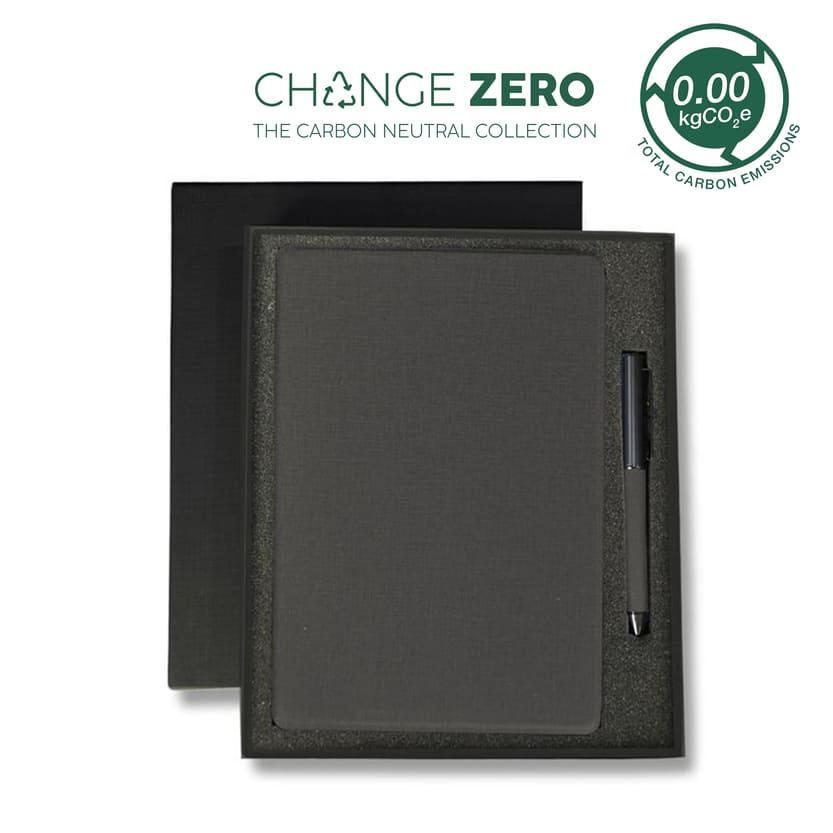 Vardim is a CHANGE ZERO Sustainable Gift Set containing a GRS-certified recycled PU refillable A5 ruled hardcover notebook and a matching recycled PU ball pen. Elegantly design, and sustainable by nature. Vardim is a CHANGE ZERO gift set, which means that it is developed with a net zero carbon footprint – By using GRS-certified recycled PU materials, we reduce 36% carbon emissions by recycled material use (calculated by ecoact®). Further, we offset the balance 1.25 kgCO2eq per unit by financing renewal energy projects through Climate Partner, making it a carbon-zero product. Packed in an elegant gift box.