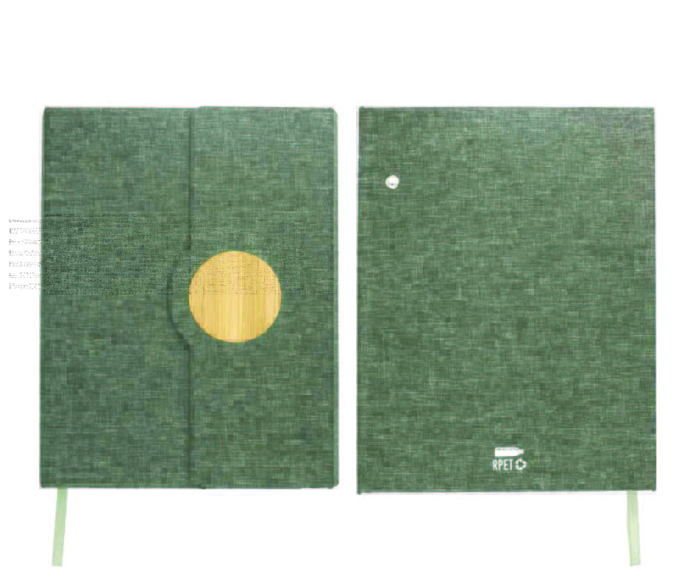 Material: The notebooks are made from RPET (Recycled Polyethylene Terephthalate), which is a type of plastic material derived from recycled PET bottles. By using RPET, these notebooks help reduce plastic waste and promote the concept of circular economy and recycling.