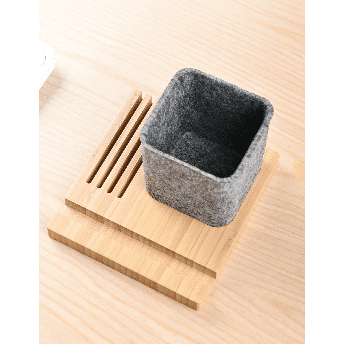 Pen box holder with card holders and phone stand Recycled Felt+Bamboo-RCS material. Product Size: 13.9x13x9.5cm. Packaging: Kraft Paper Box