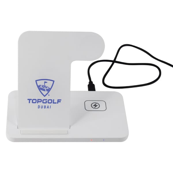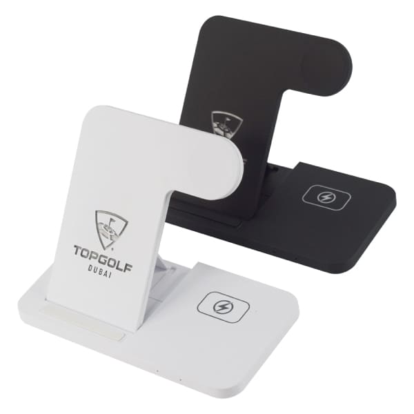 FAST CHARGING STAND 3 IN 1 Multi- Function Charging Stand a new series of POWERED wireless charging options, one of which is a new 3-in-1 dock meant to charge the iPhone, Apple Watch, AirPods, and other devices that support Qi-based wireless charging. Specifications: Product Standard: Qi Input: DC9V/2A,DC5V/3A Output power: 15w Watch: 2w Earphone: 5w Charging frequency: 110-205 KHz Charging distance: 4-8mm Charging efficiency: 75% Frequency: 110-205KHz Product Size : 163x150x12mm Printing Option : Engraving, UV Printing