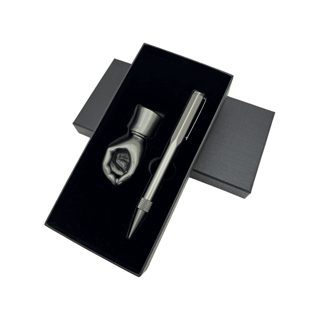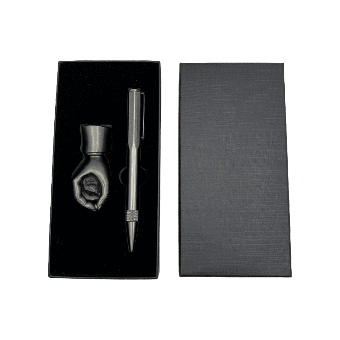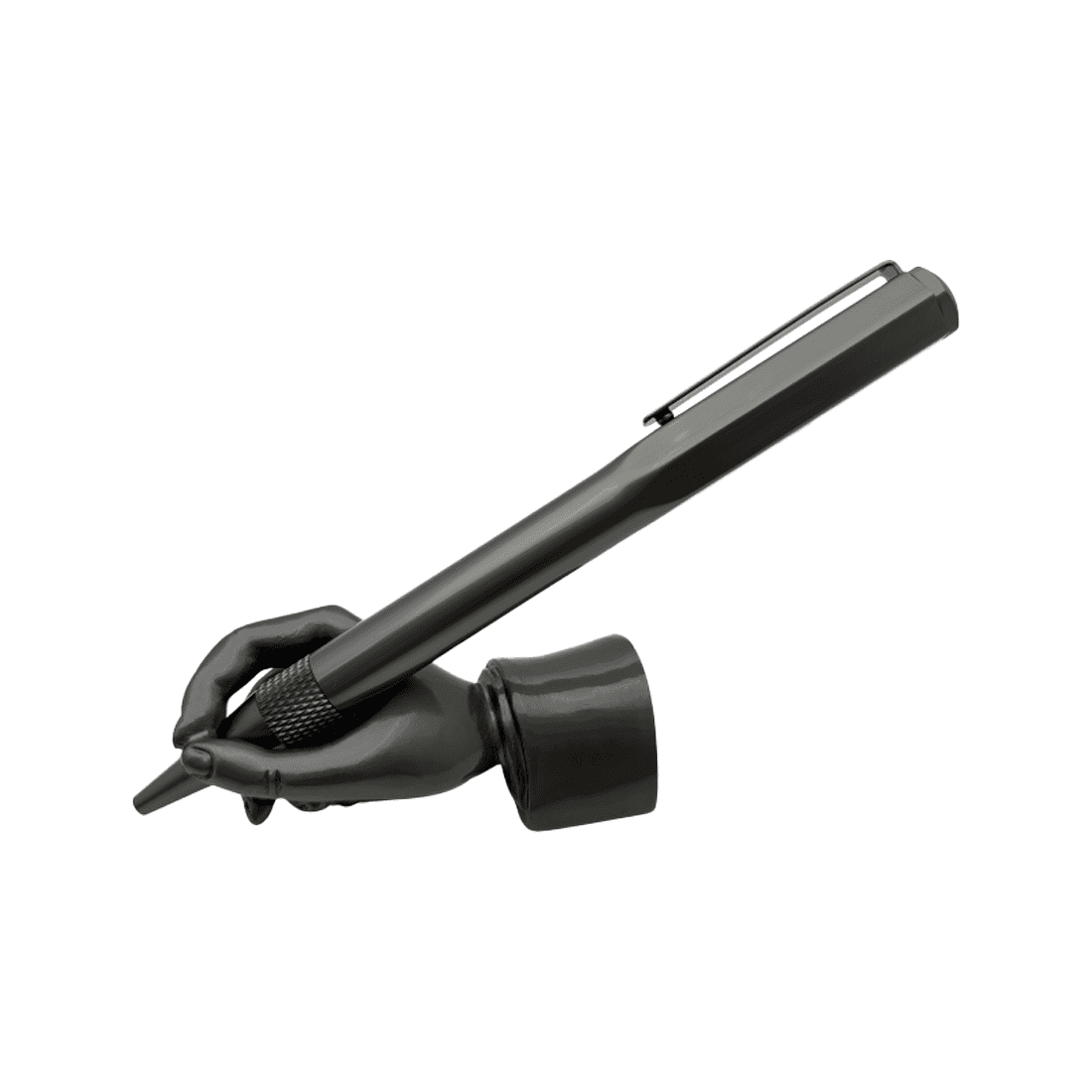 Luxury VIP Pen set in electroplated hexagonal brass ballpoint twist pen and zinc alloy hand shape pen holder paper weight. Handy Pen that gives more class to your table as it looks elegant on the top of it. Product Size: 18x9x3.5cm. Packaging: Hard paper box