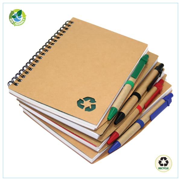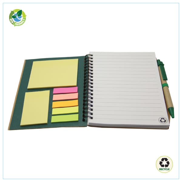 NOTEBOOK ECO FRIENDLY These natural color Notebooks feature a die-cut environment friendly for a clean surrounding, Notebook includes a matching ball pen ruled paper and an additional sheet of sticky notes.