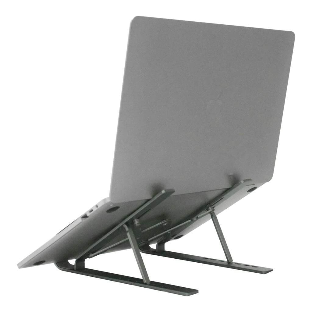 Skara is a quality folding laptop stand made of heavy-duty aluminum and including extendable, height-adjustable legs with anti-slip rubber pads for a solid fit to the laptop computer and desk surface. Compact folding size, and presented in a gift box.
