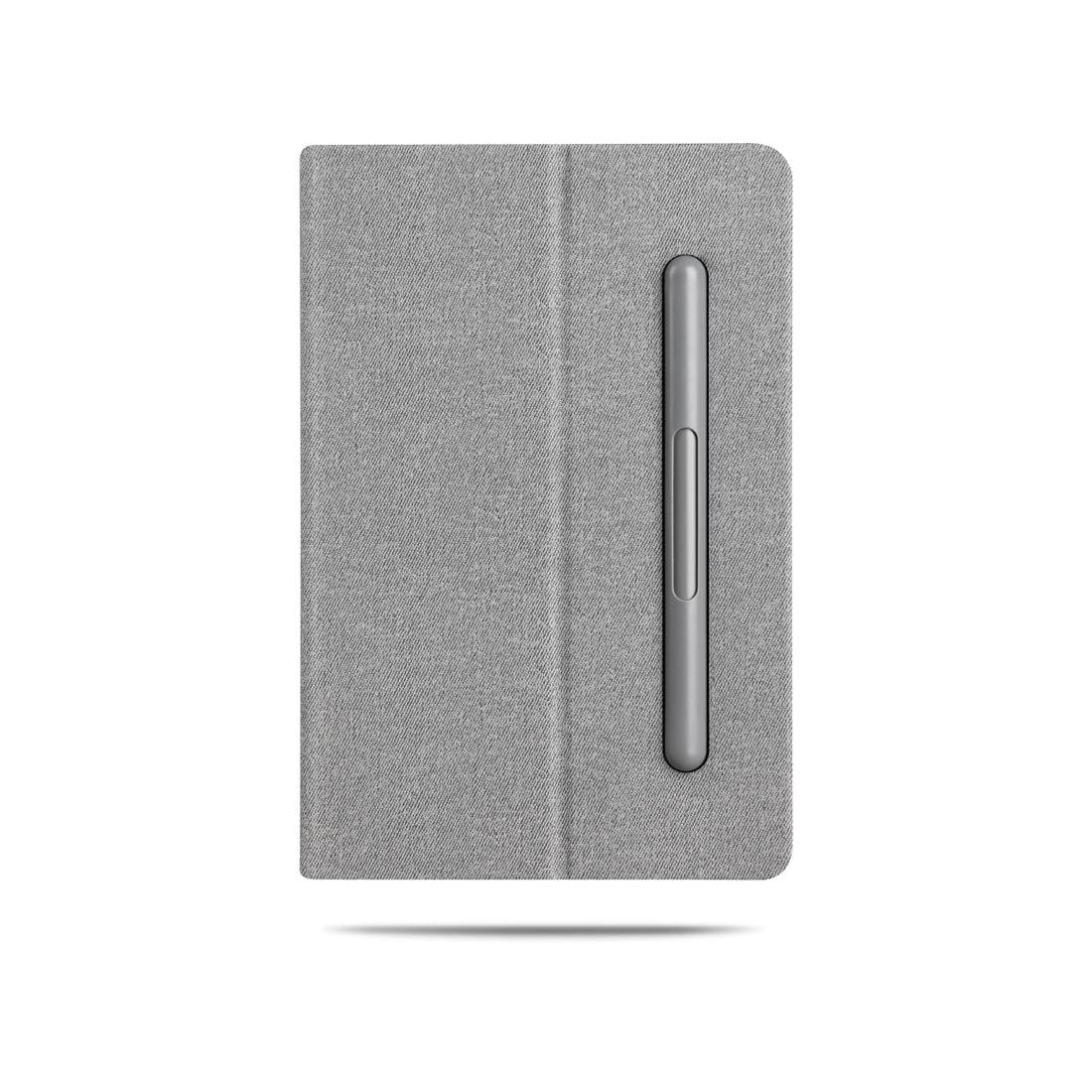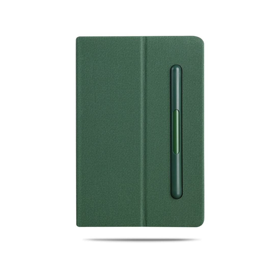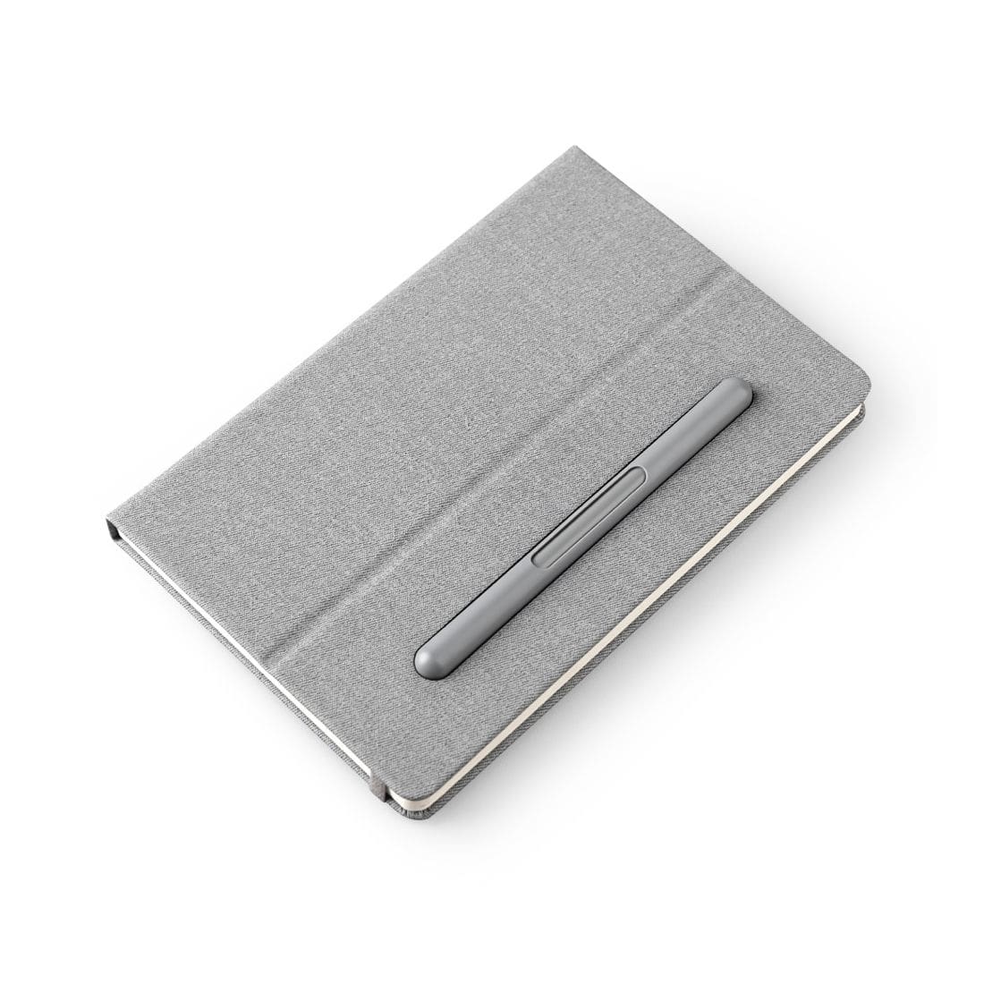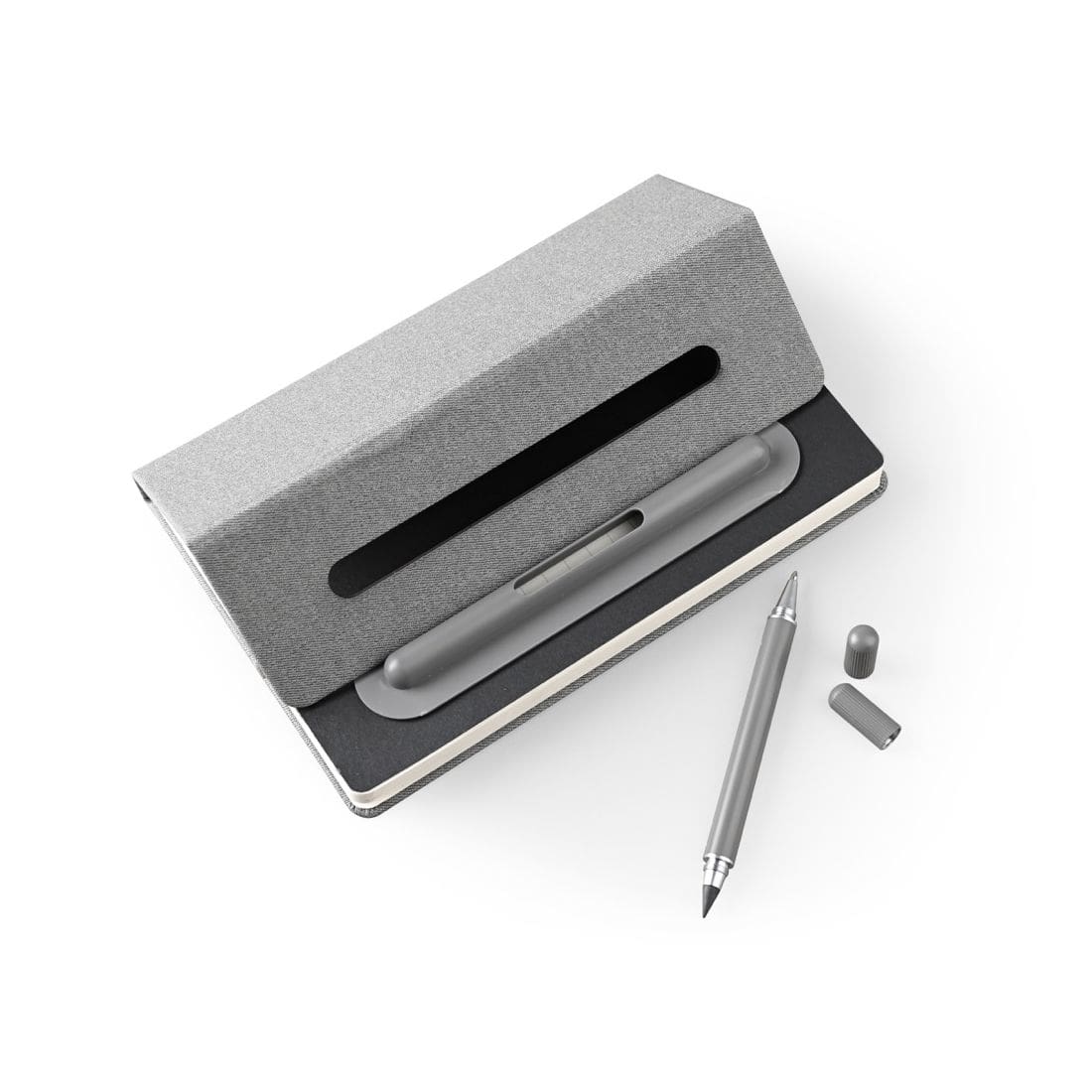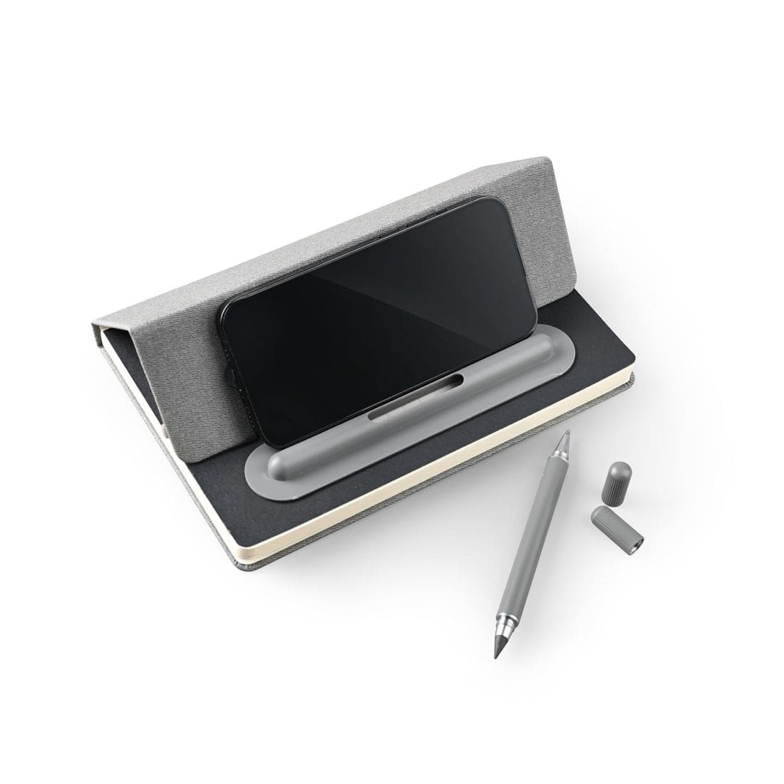 A5 Notebook with 2n1 writing instruments: pen and pencil on the otherside and has elastic for closure in recycled PU Material. Notebook has fold on the cover that serves as a mobile stand. Product Size: 20×14.1×1.5cm. Packaging: Kraft Paper Box
