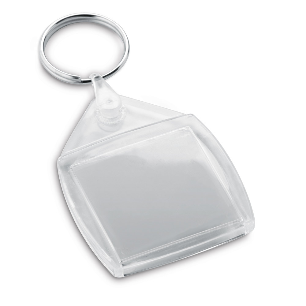Square shaped clear PS keyring. Made in Europe. 43 x 55 x 5 mm