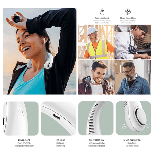 Tired of feeling the heat on your neck on hot summer days? Frustrated with sweating as soon as you leave the house? Bored of the hassle of carrying portable fans in your hands until they hurt? The Portable Neck Cooler in a premium ivory white finish solves all these problems. It is very easy to use and can be worn for long periods of time. It works with Type C charging interface so you can easily charge it anywhere and it can be used at different speeds according to the degree of cooling you want. It is perfect for people who use the metro and other public transportation to commute, and also great for people who like to exercise outdoors! It is also extremely safe to use as it utilizes bladeless fan technology.